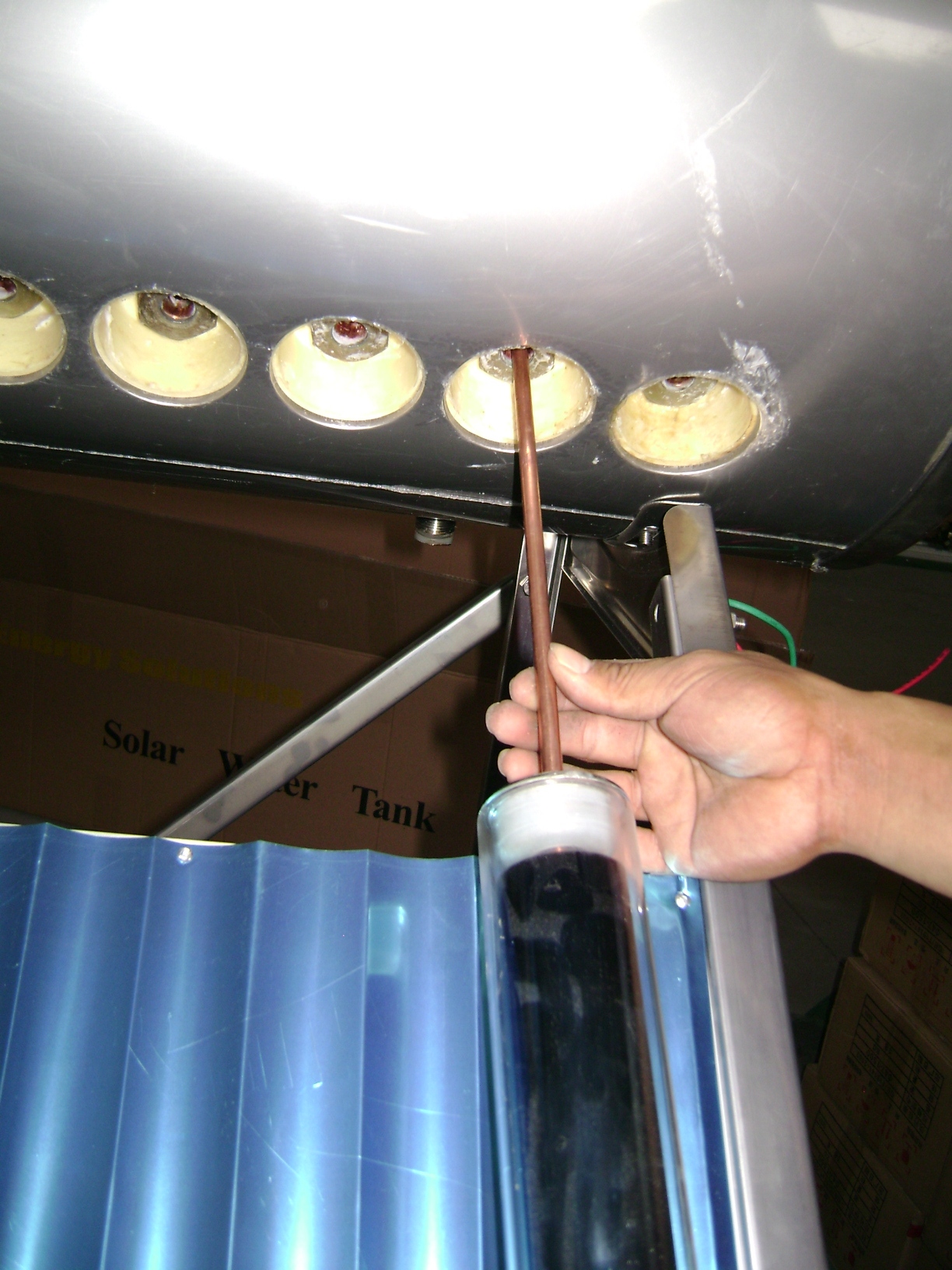 18 heat pipe collector. SC tube with copper pipe and aluminium fin in it. The transfer fluid in copper pipe is 99% pure water and 1% acetone. Thickness of tube is 1.6mm. Diameter is 58mm. Length: 1800mm. copper thickness is 1.6mm.